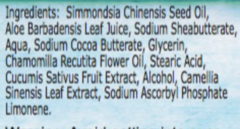 Ingredients: Aloe vera juice, shea butter, cocoa butter, sweet almond oil, jojoba oil, stearic acid, sodium hydroxide, cucumber extract, natural essential oil, vitamin C