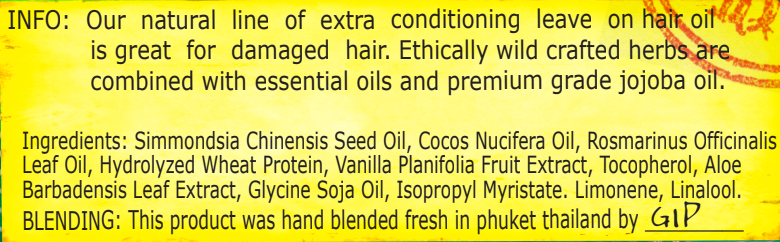 Our natural line of extra conditioning Hair Oil is great for restoring damaged or over processed hair. Made with infusions of organically grown or ethically wild crafted herbs and combined with essential oils and premium grade jojoba oil.