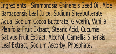 Ingredients: Aloe vera juice, shea butter, cocoa butter, sweet almond oil, jojoba oil, stearic acid, sodium hydroxide, cucumber extract, natural essential oil, vitamin C